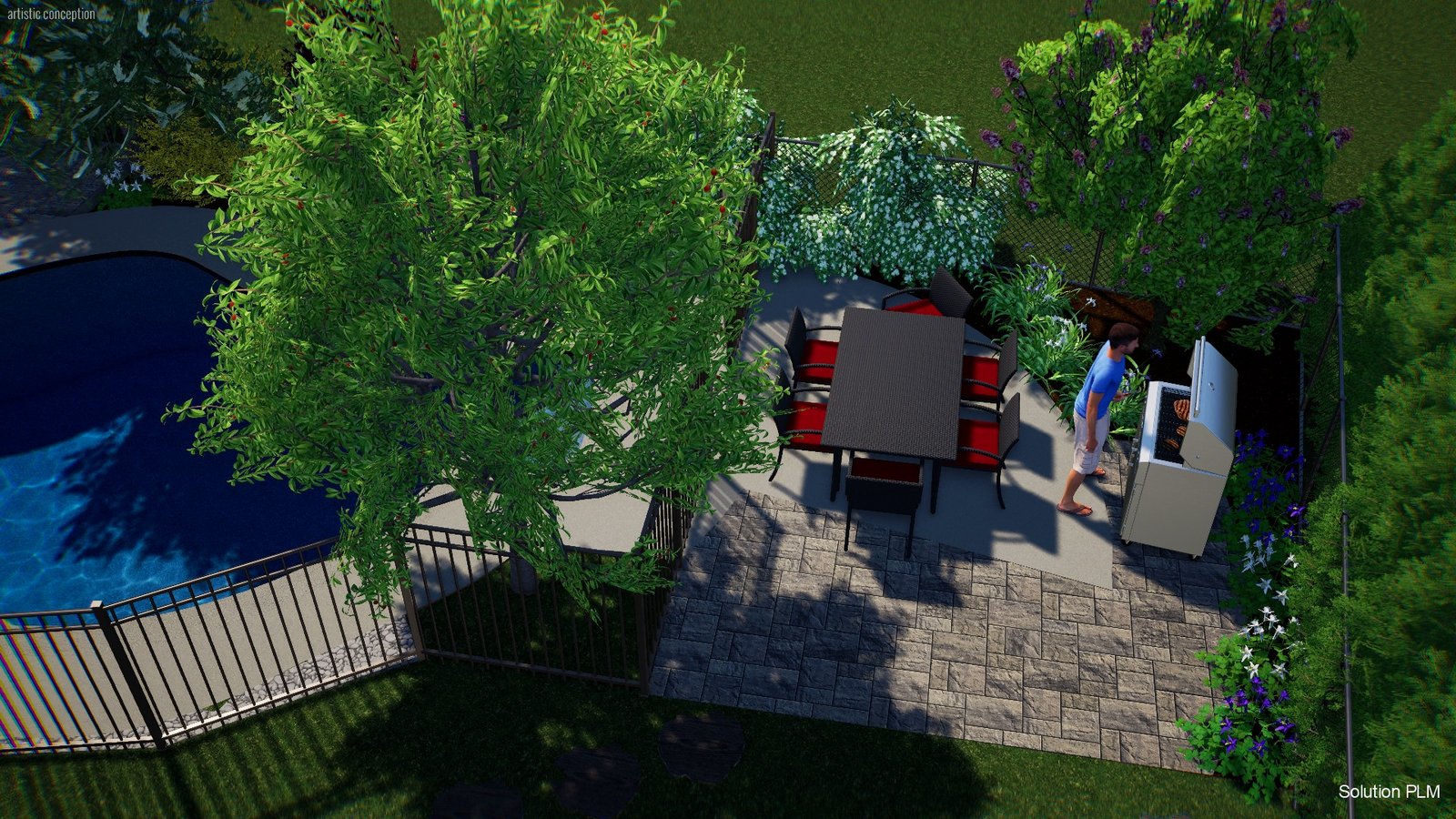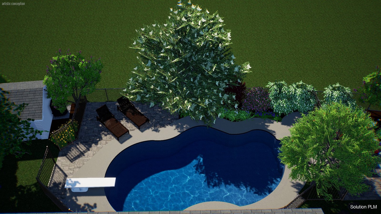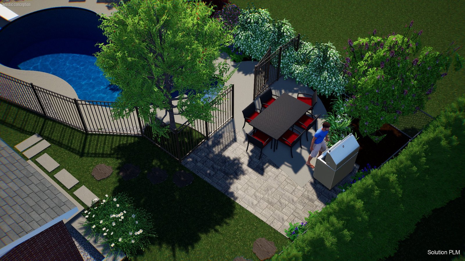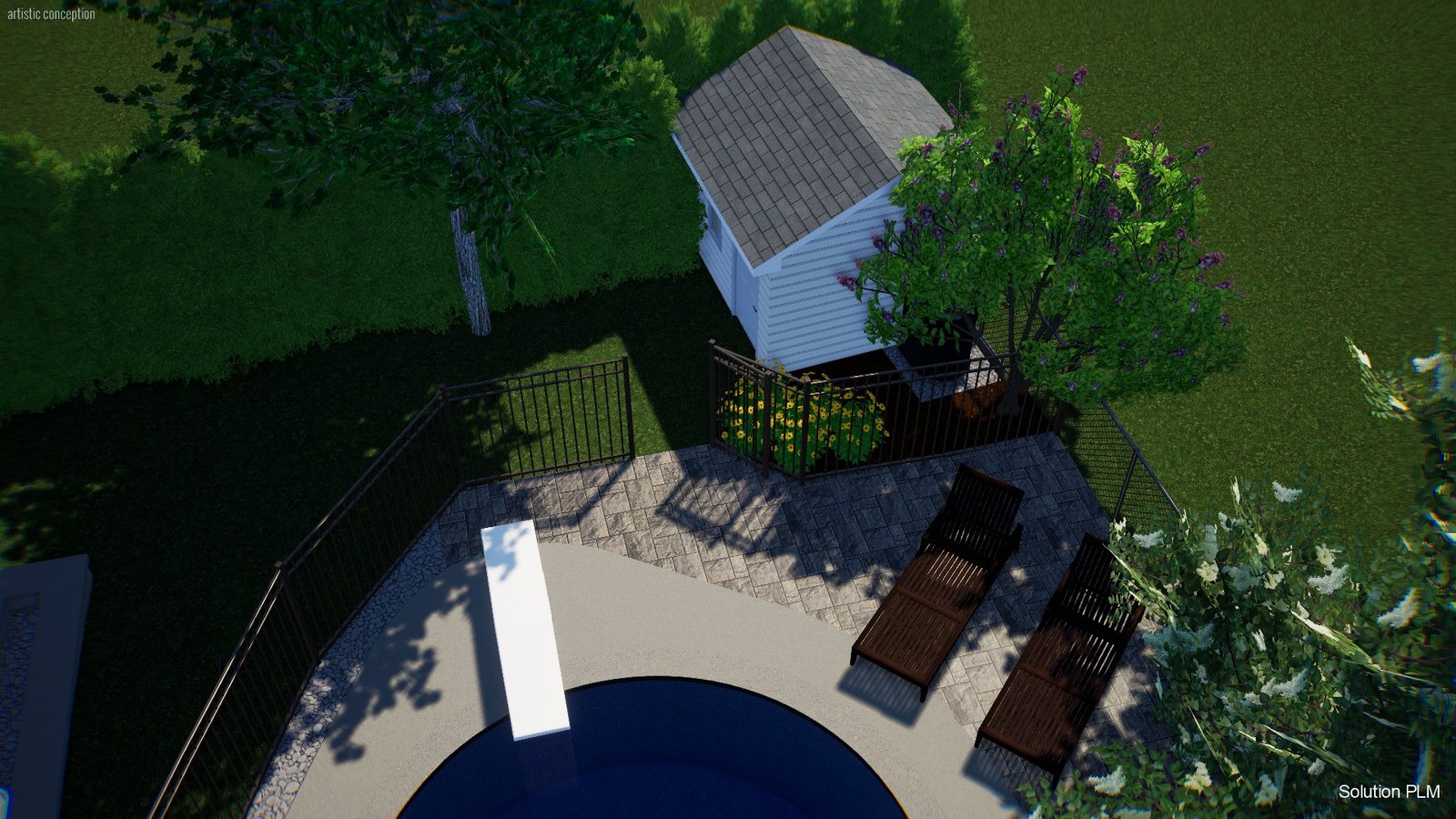 Aménagement d’un terrain après rénovation majeure, régler problème d’eau, clôture section piscine, zone de plantation.